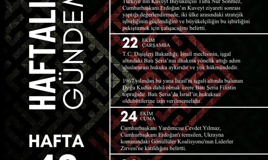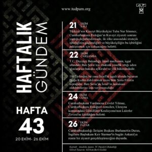 TUDPAM Araştırma Asistanı Görkem Berk Gedikli‘nin hazırlayıp tasarladığı “Haftalık Gündem 2025 42. Hafta” isimli Türk Dış Politikasının haftalık gündem infografiği sizler için beğenilerinize sunulmaktadır.