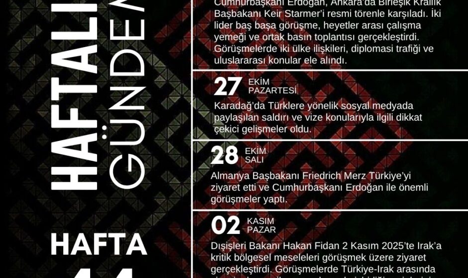 TUDPAM Araştırma Asistanı Görkem Berk Gedikli‘nin hazırlayıp tasarladığı “Haftalık Gündem 2025 44. Hafta” isimli Türk Dış Politikasının haftalık gündem infografiği sizler için beğenilerinize sunulmaktadır.