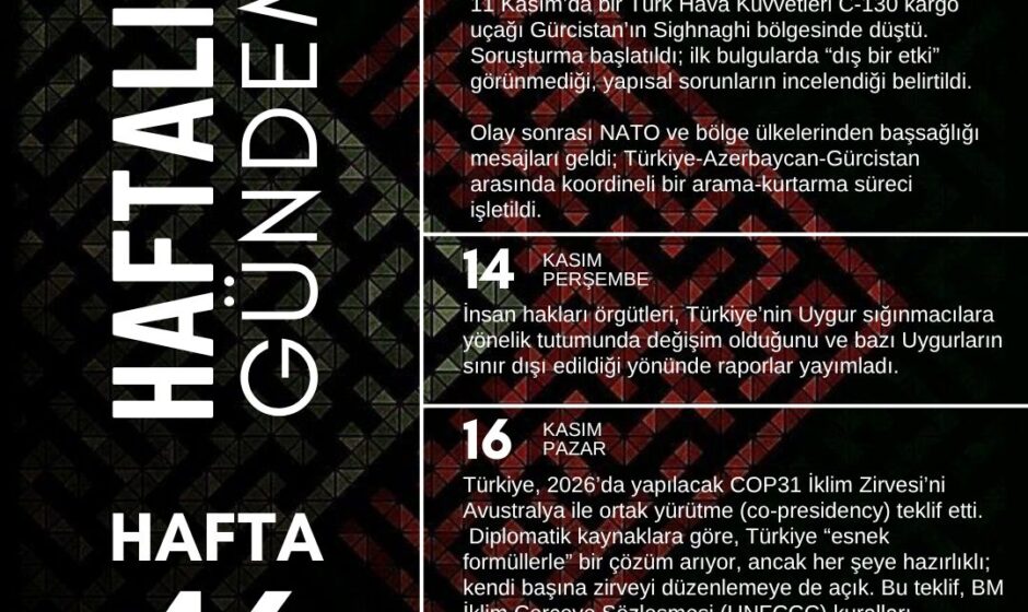 TUDPAM Araştırma Asistanı Görkem Berk Gedikli‘nin hazırlayıp tasarladığı “Haftalık Gündem 2025 46. Hafta” isimli Türk Dış Politikasının haftalık gündem infografiği sizler için beğenilerinize sunulmaktadır.