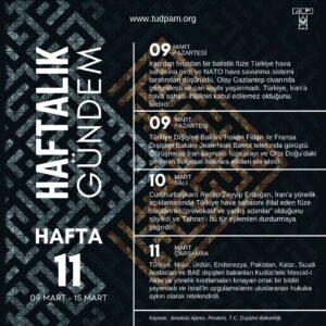 TUDPAM Araştırma Asistanı Görkem Berk Gedikli‘nin hazırlayıp tasarladığı “Haftalık Gündem 2026 11. Hafta” isimli Türk Dış Politikasının haftalık gündem infografiği sizler için beğenilerinize sunulmaktadır.