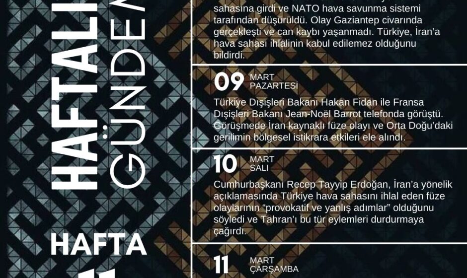 TUDPAM Araştırma Asistanı Görkem Berk Gedikli‘nin hazırlayıp tasarladığı “Haftalık Gündem 2026 11. Hafta” isimli Türk Dış Politikasının haftalık gündem infografiği sizler için beğenilerinize sunulmaktadır.