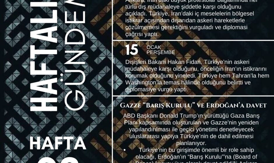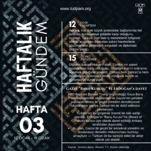 TUDPAM Araştırma Asistanı Görkem Berk Gedikli‘nin hazırlayıp tasarladığı “Haftalık Gündem 2026 3. Hafta” isimli Türk Dış Politikasının haftalık gündem infografiği sizler için beğenilerinize sunulmaktadır.