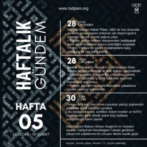 TUDPAM Araştırma Asistanı Görkem Berk Gedikli‘nin hazırlayıp tasarladığı “Haftalık Gündem 2026 5. Hafta” isimli Türk Dış Politikasının haftalık gündem infografiği sizler için beğenilerinize sunulmaktadır.