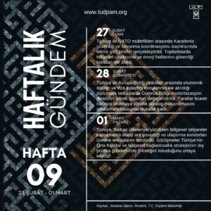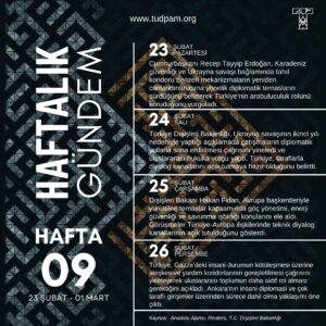 TUDPAM Araştırma Asistanı Görkem Berk Gedikli‘nin hazırlayıp tasarladığı “Haftalık Gündem 2026 9. Hafta” isimli Türk Dış Politikasının haftalık gündem infografiği sizler için beğenilerinize sunulmaktadır.