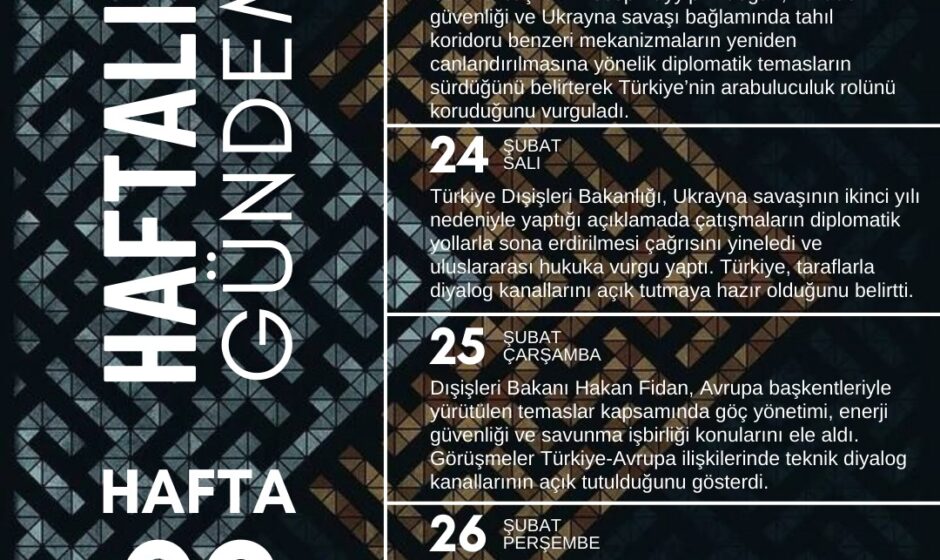 TUDPAM Araştırma Asistanı Görkem Berk Gedikli‘nin hazırlayıp tasarladığı “Haftalık Gündem 2026 9. Hafta” isimli Türk Dış Politikasının haftalık gündem infografiği sizler için beğenilerinize sunulmaktadır.