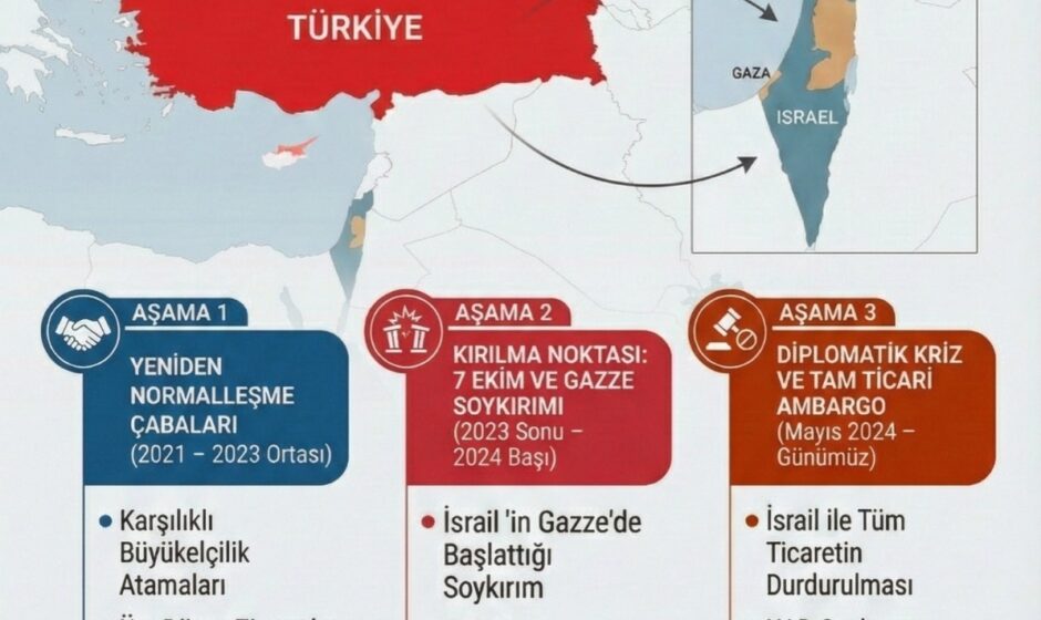 Türkiye-İsrail ilişkilerinde son dönemde yaşanan dönüşüm; normalleşme sürecinden tam ticari ambargoya uzanan üç aşamalı bir çerçeveyle ele alınmaktadır.