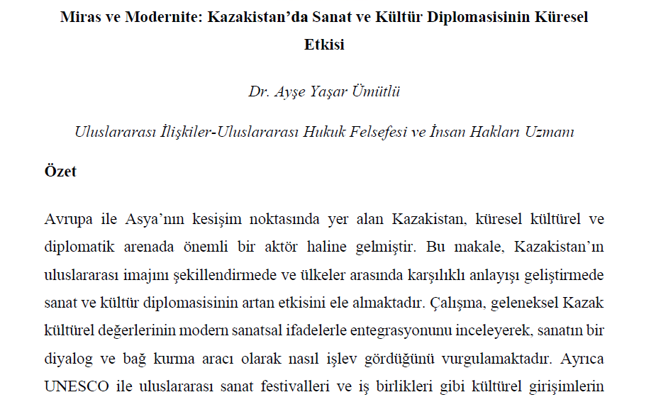 Uluslararası İlişkiler-Uluslararası Hukuk Felsefesi ve İnsan Hakları Uzmanı Dr. Ayşe Yaşar Ümütlü‘nün kaleme aldığı “Miras ve Modernite: Kazakistan’da Sanat ve Kültür Diplomasisinin Küresel Etkisi” başlıklı TUDPAM‘ın 12. raporunda Ümütlü, bu çalışmasında Kazakistan’ın uluslararası imajını şekillendirmede ve ülkeler arasında karşılıklı anlayışı geliştirmede sanat ve kültür diplomasisinin artan etkisini ele almaya çalışmıştır.