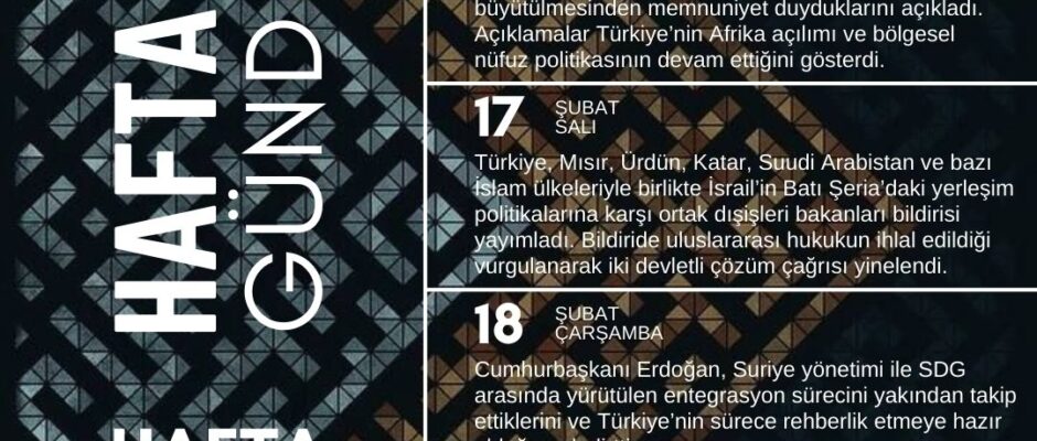 TUDPAM Araştırma Asistanı Görkem Berk Gedikli‘nin hazırlayıp tasarladığı “Haftalık Gündem 2026 8. Hafta” isimli Türk Dış Politikasının haftalık gündem infografiği sizler için beğenilerinize sunulmaktadır. Hazırlayan: Görkem Berk Gedikli Tasarlayan: Görkem Berk Gedikli
