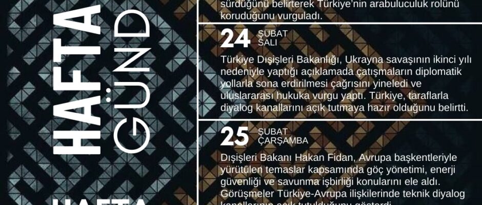 TUDPAM Araştırma Asistanı Görkem Berk Gedikli‘nin hazırlayıp tasarladığı “Haftalık Gündem 2026 9. Hafta” isimli Türk Dış Politikasının haftalık gündem infografiği sizler için beğenilerinize sunulmaktadır. Hazırlayan: Görkem Berk Gedikli Tasarlayan: Görkem Berk Gedikli